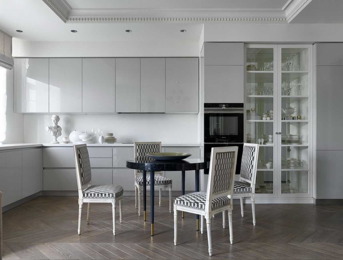 Классический стол и стулья. Располагают их обычно в удалении от рабочей поверхности. Иногда эта часть комнаты обосабливается с помощью контрастных цветовых решений. Вариантов исполнения множество: круглый, квадратный, овальный, треугольный, либо стол неправильной формы. Дополнять его могут стулья, табуреты, пуфики или кресла. Подходящее решение можно найти под любой стиль и дизайн. При этом серую кухню может