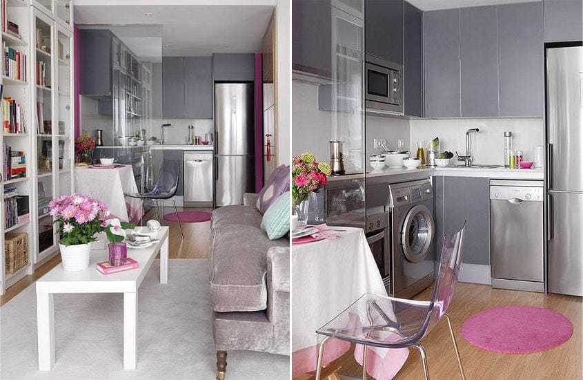 Выбирая планировку, стоит помнить о свободном подходе. Любой вариант покажется неудачным, если диван или стул будут перекрывать проход к мойке, а барная стойка не даст открыть дверь холодильника.