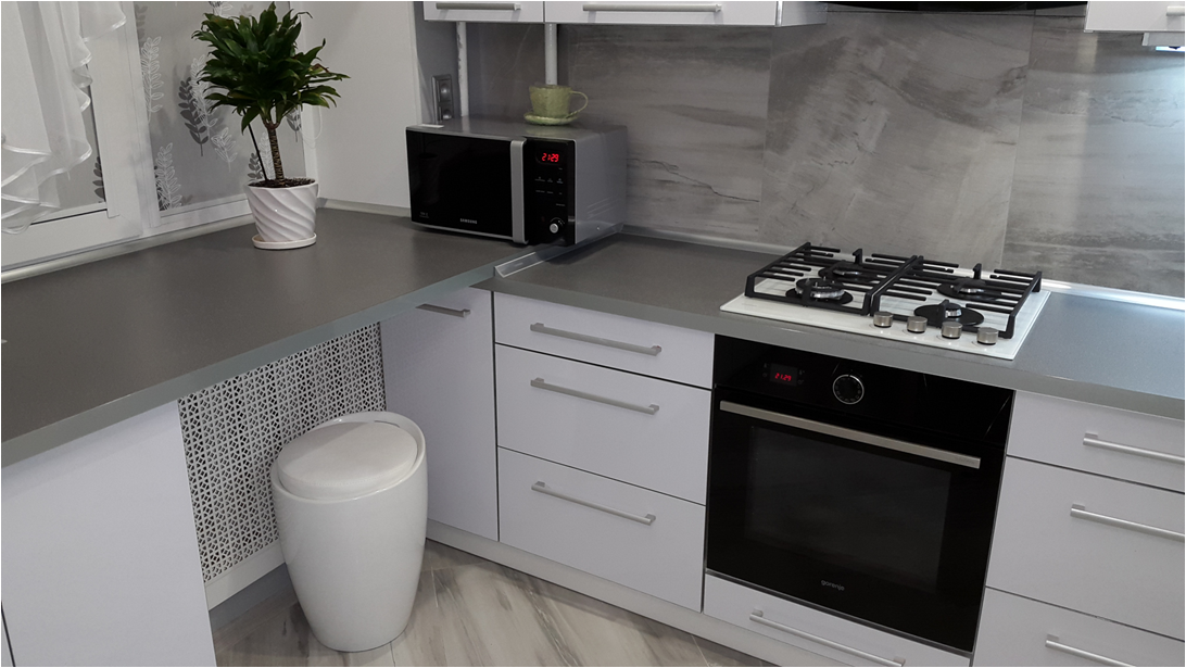 С фасадами «под бетон» можно использовать практически все варианты столешниц. В зависимости от стиля дополнить кухонный гарнитур можно столешницей из: