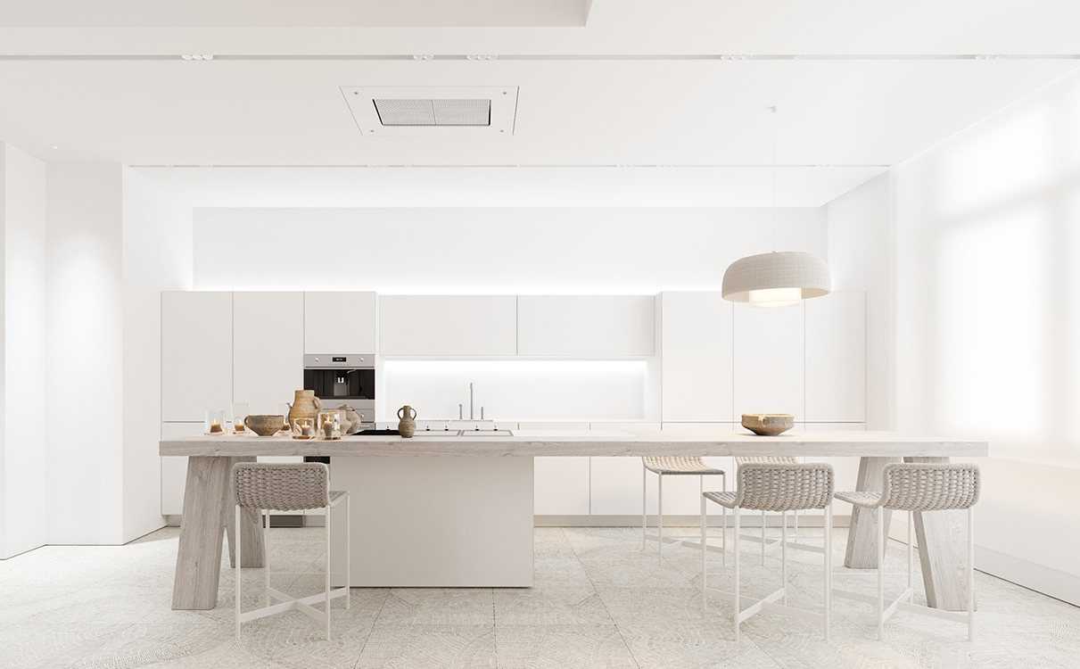 Кухня в белых тонах Цветная палитра из серо-белоснежных акцентов может распространяться как на стенки, пол, так и на кухонный гарнитур. К подобному фону дизайнеры порекомендуют кардинально-противолежащие структуры и вещества. К примеру, хорошо подойдут мебель из дерева, яркий глянец фасадов, столешница из естественного кремня, фотообои. При достаточном количестве места, на кухне возможно установить диванчик. Он позволит заполнить место комфортом. Для справки! В маленькой комнатке и кухне с белым бетоном в создании домашней атмосферы помогут стулья либо табуреты, декорированные мягкими подушечками.