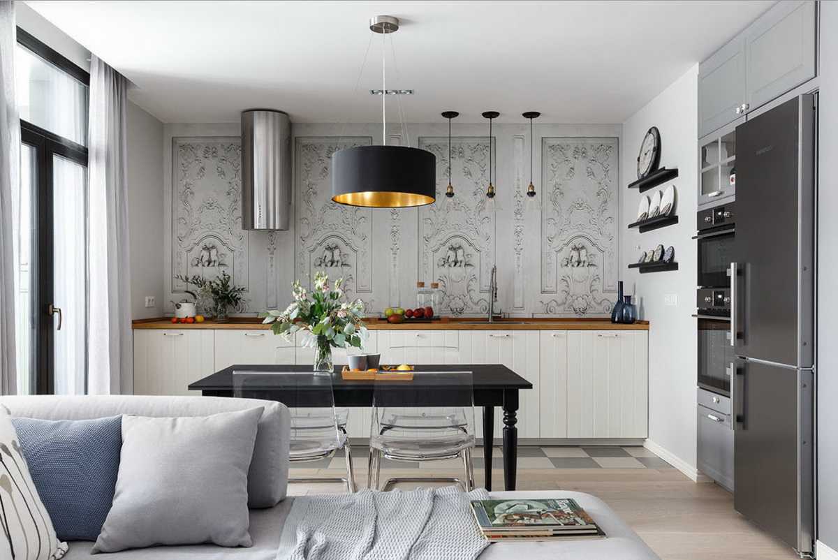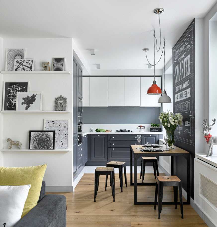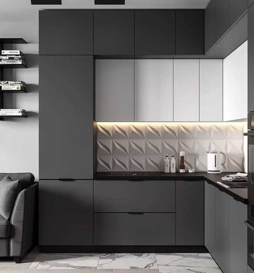 Светло-серый и чёрный – контрастное сочетание. Чёрно-серая кухня – вариант для стиля лофт. С тёмными оттенками серого чёрный выглядит брутально, но комната будет мрачная, так что такое оформление подойдёт для комнат большой площади с огромными окнами.