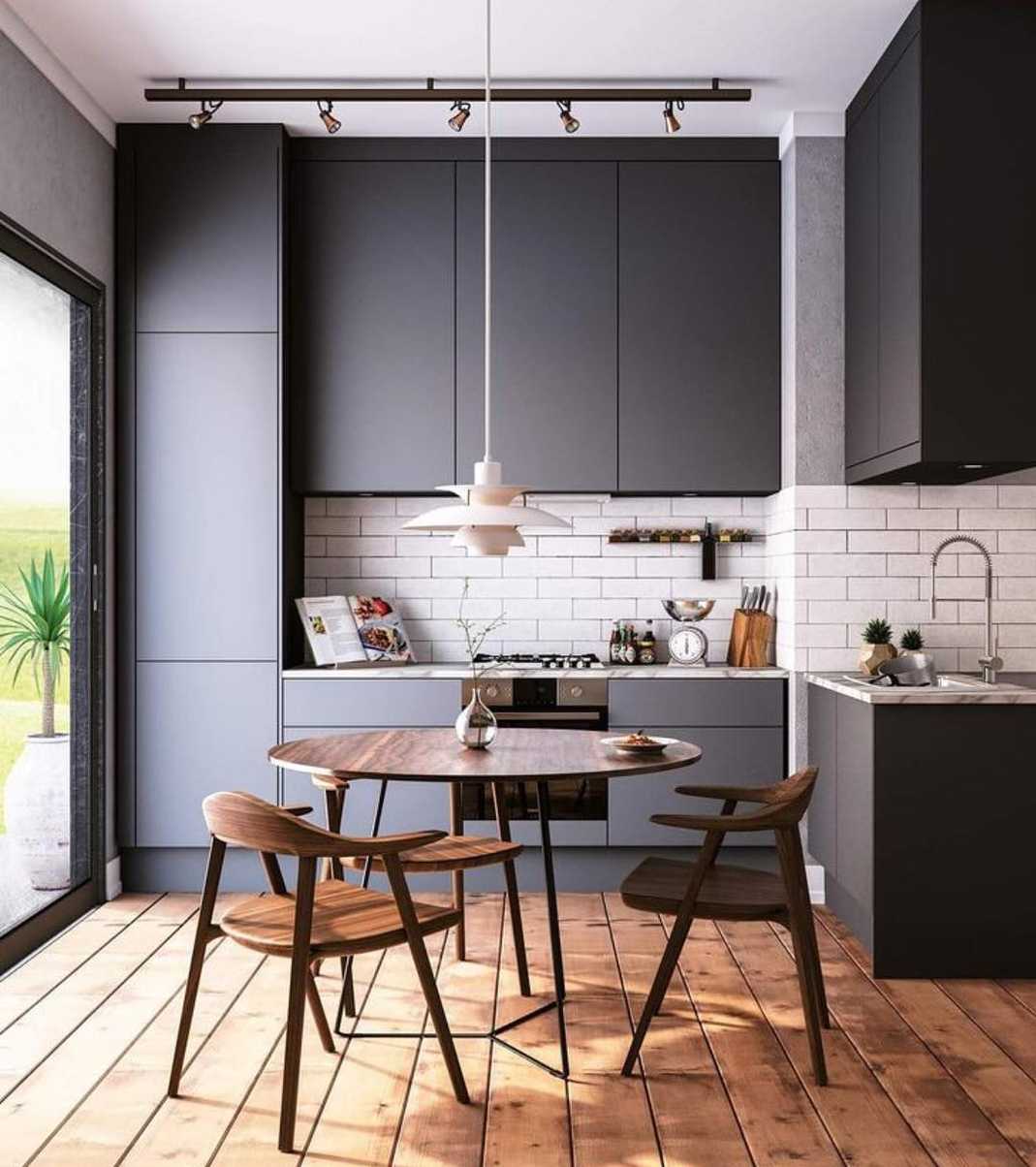 Тёмная серая матовая кухня здорово смотрится в кухне-столовой/гостиной. Но если у вас маленькая квартира и кухонное помещение (к примеру, как в хрущевках) лучше отдать предпочтение глянцевым вариантам.