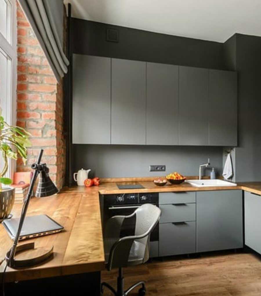 Комбинация подходит и для лофта — коричневый кирпич, темная столешница и много дымчатых тонов. Кухня выглядит необычно, но стильно. Подберите оригинальные тематические предметы декора — они довершат созданную ремонтом атмосферу.