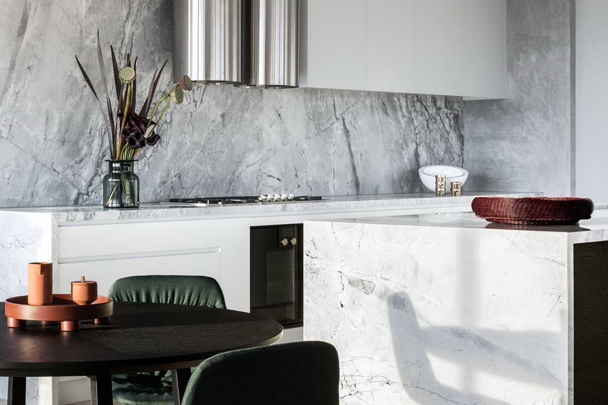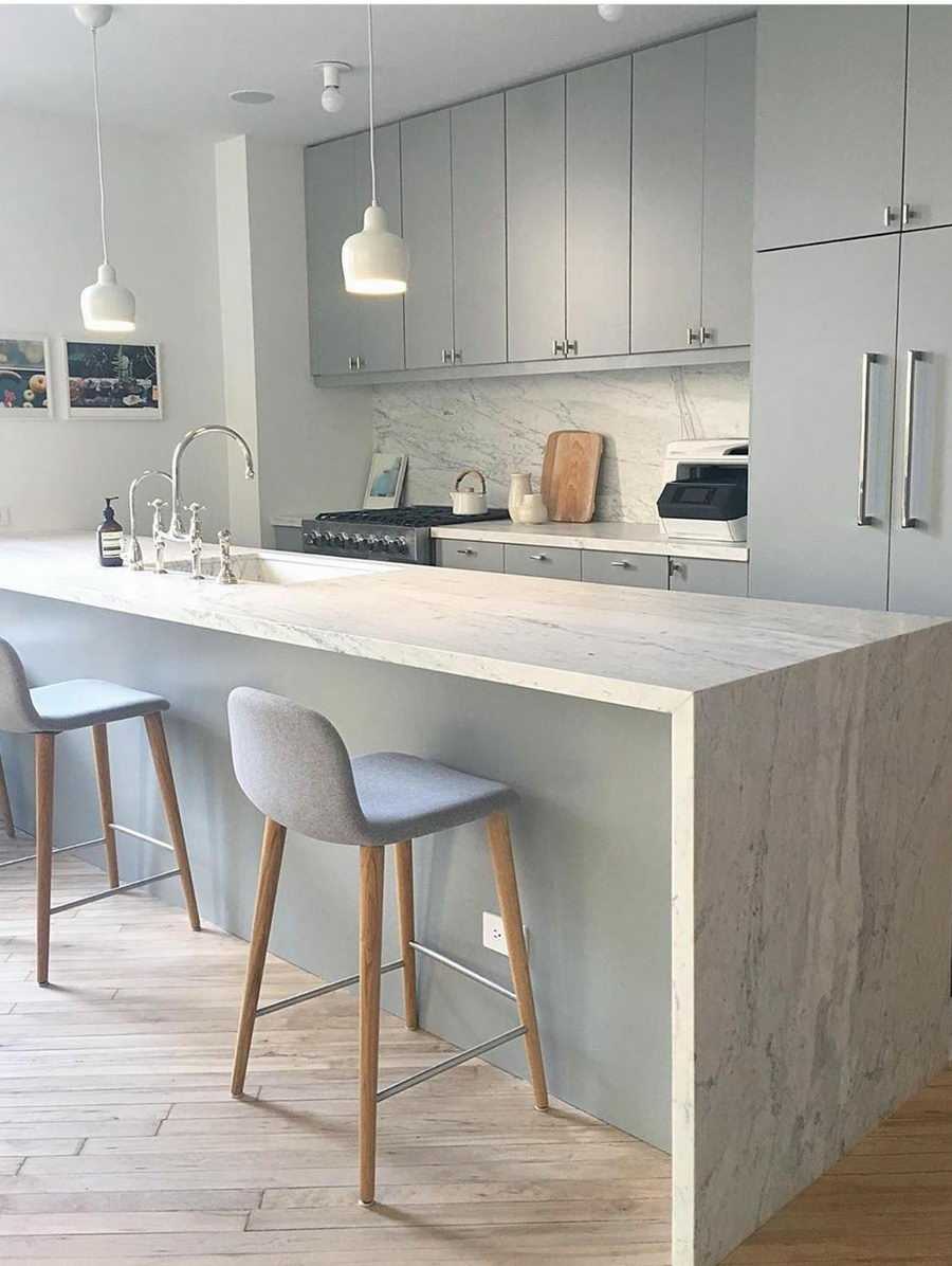 Правильный оттенок серого и правильные прожилки в мраморе могут быть абсолютно идеальным сочетанием. Мрамор украсит любую кухню, а его использование в таком количестве еще больше улучшит внешний вид. Нам также нравится, как светильники объединяют это пространство.