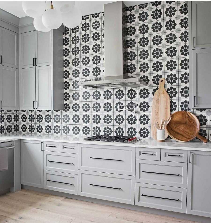 Нам нравится сочетание столешниц и узоров на этой шикарной кухне.