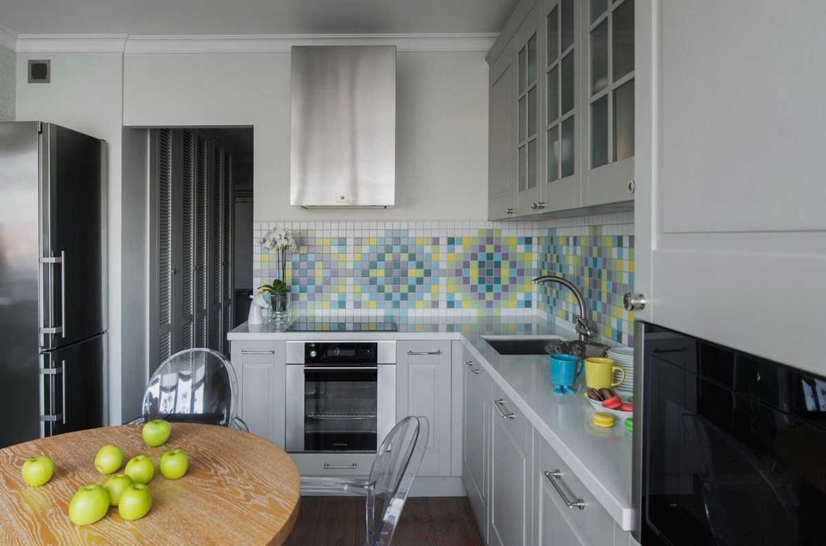 Если в большой рабочей площади необходимости нет, то можете расположить его вдоль одной из стен. В таком случае посоветуем сделать необычный фартук. Например, из мелкой мозаики той же цветовой палитры.