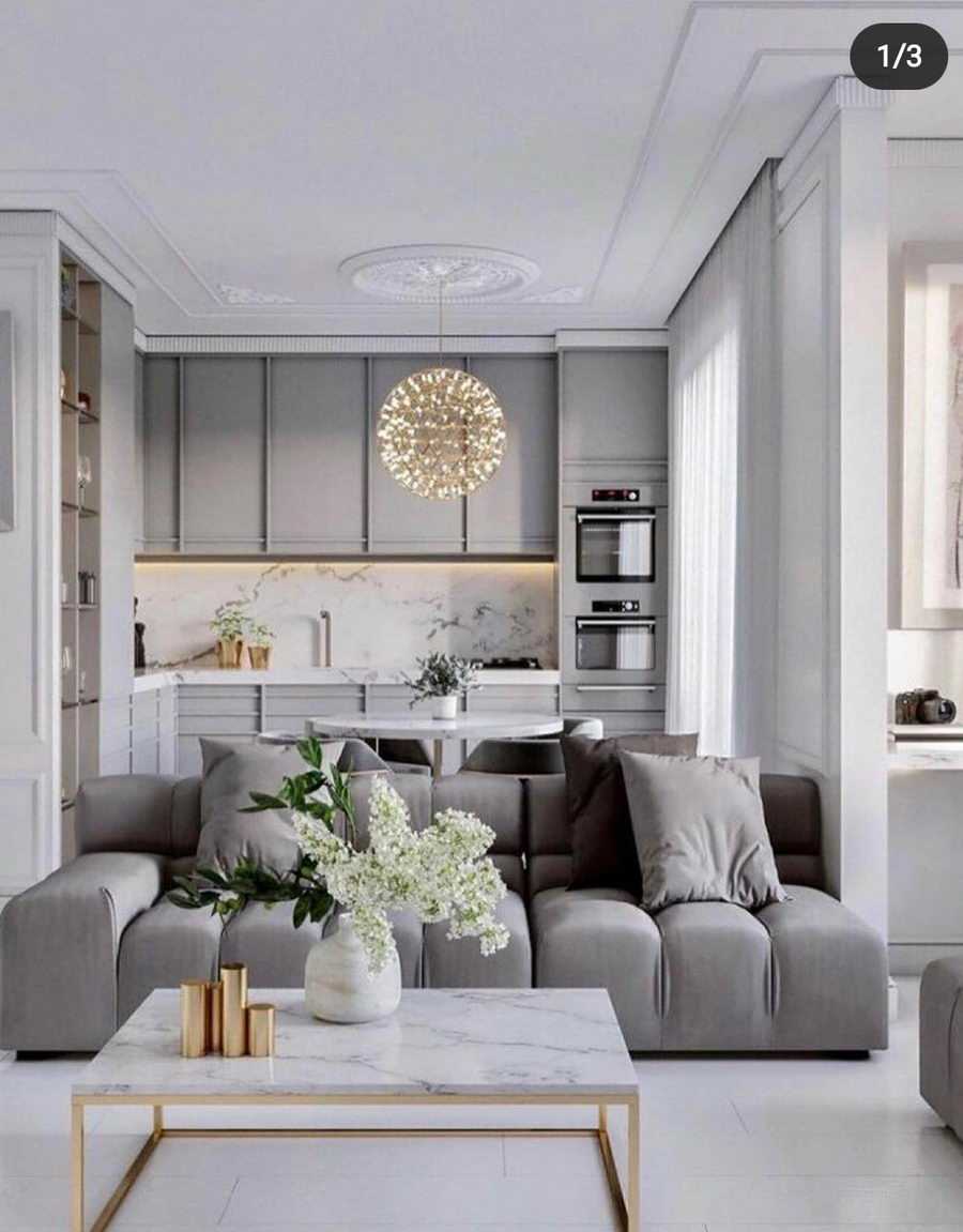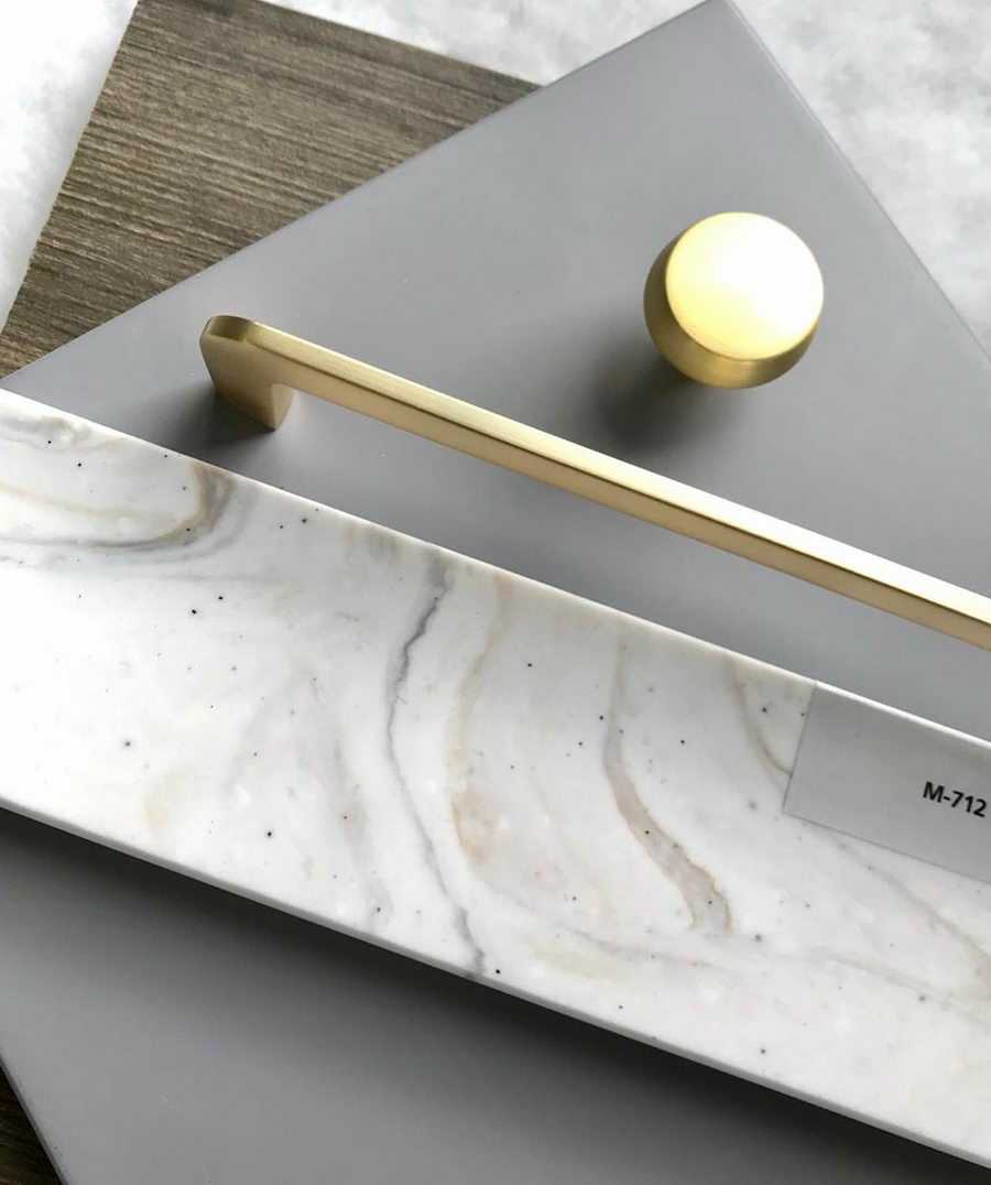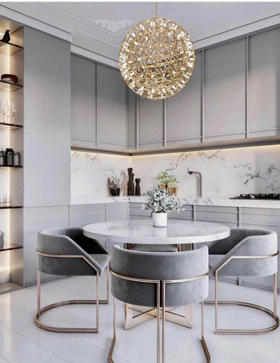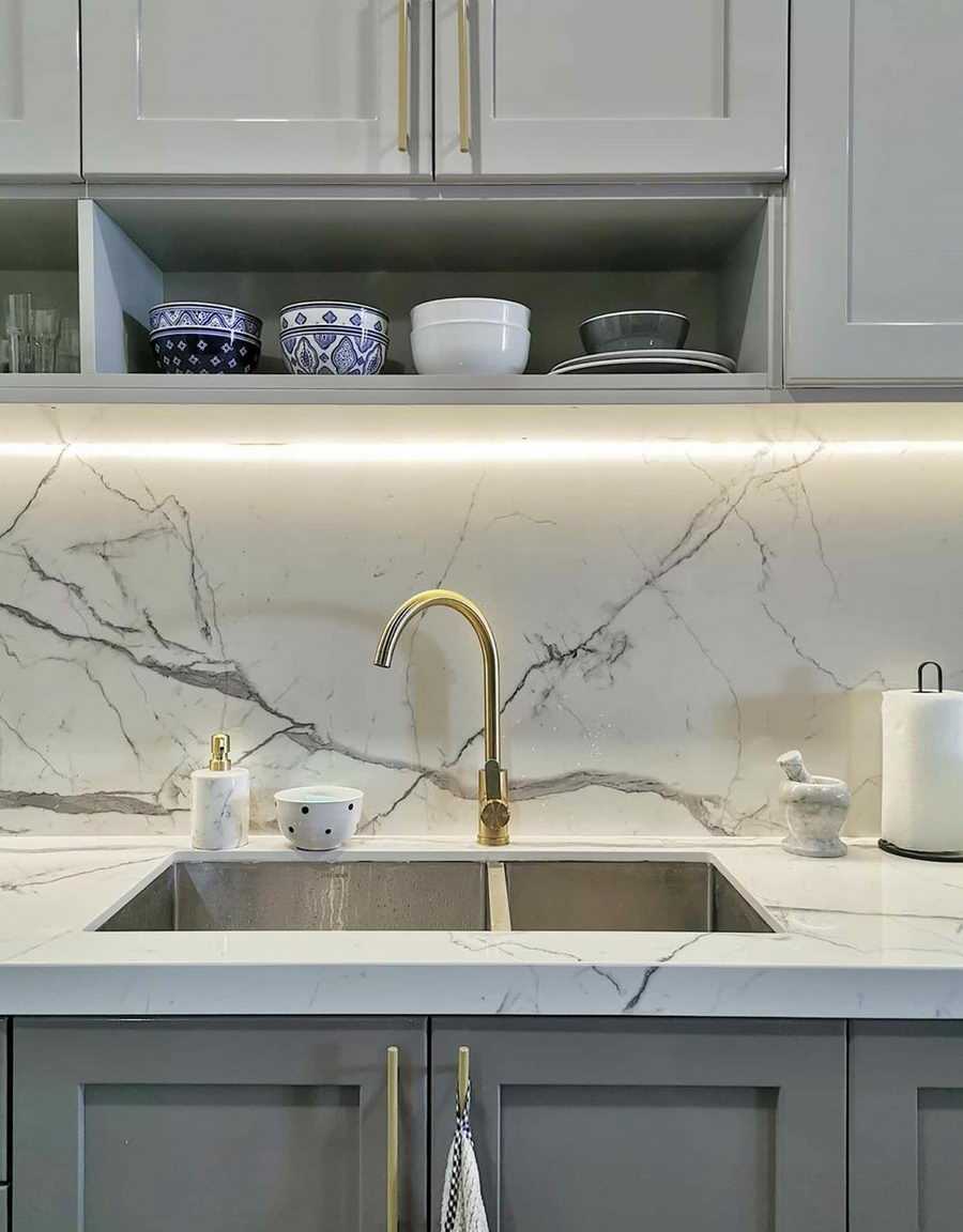 Люблю эти шикарные современные серые шкафы. Золотые акценты, мраморный фартук и столешницы придают этой кухне ультра-роскошный вид.