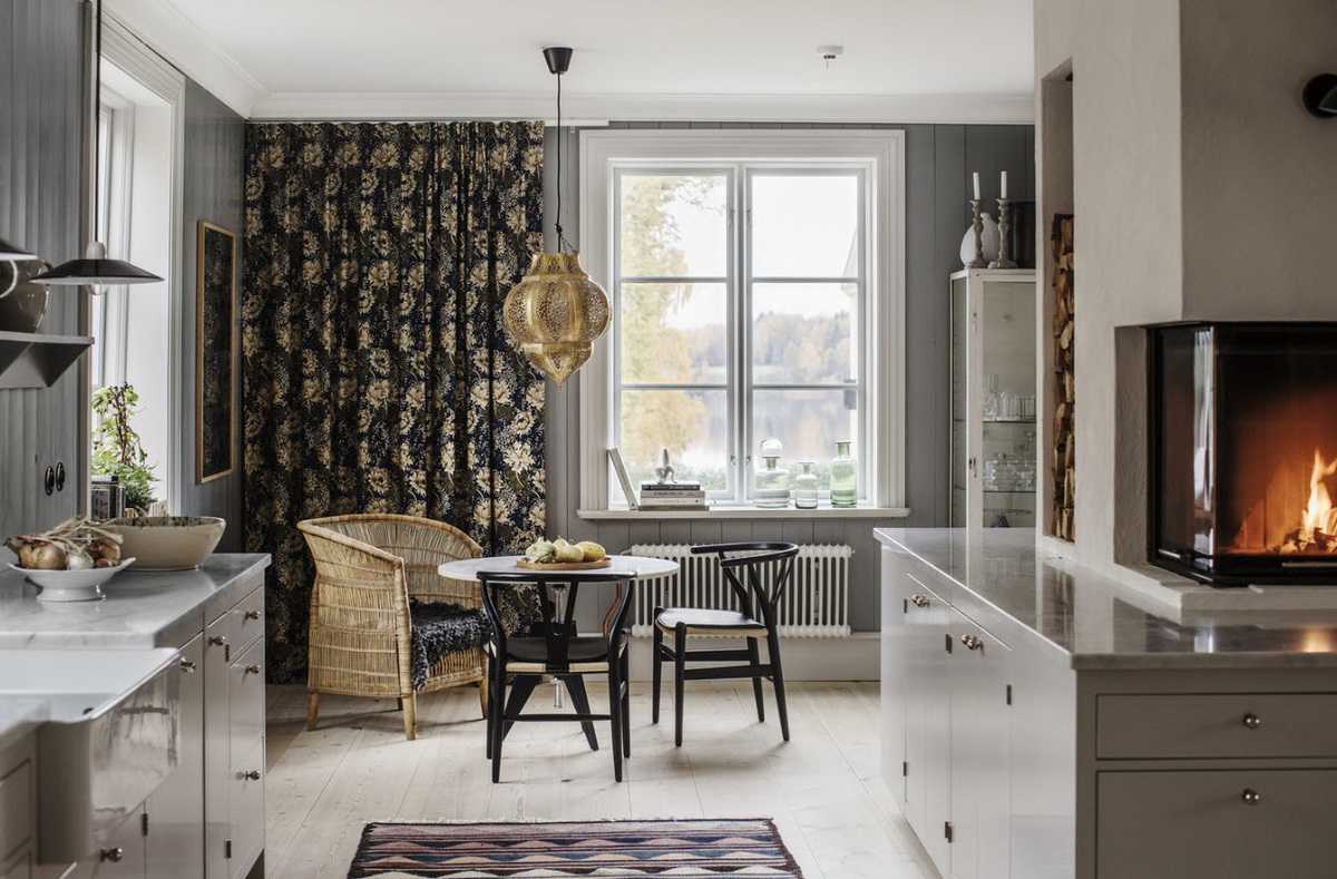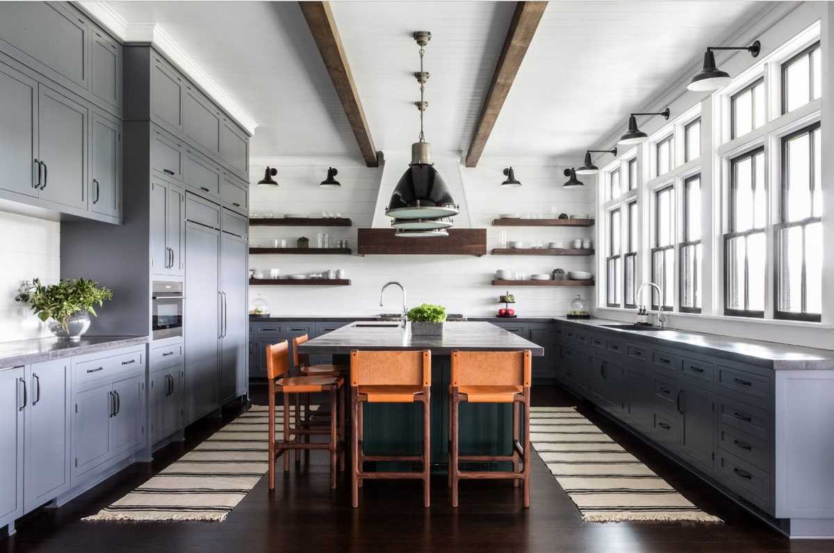 Для создания классического деревенского стиля нам нравится эта кухня в деревенском стиле, в которой темно-серые шкафы сочетаются с теплыми оттенками дерева на полу, потолке и другими шкафами. Ярко-белая краска и столешницы делают эту кухню легкой и чистой.