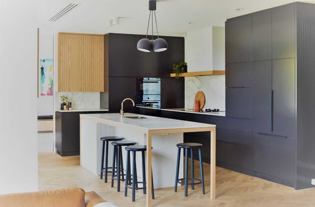 Современные плоские шкафы с угольно-серой столешницей и отделкой из орехового дерева — это современный взгляд на стандартную обтекаемую кухню. Яркие окна от пола до потолка украшают пространство и делают его большим и связанным с внешним миром.