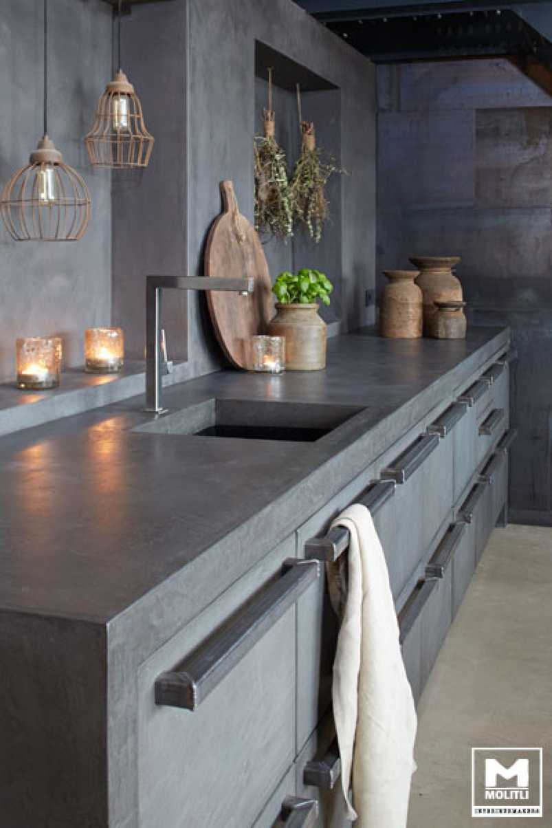 Серый здесь монохромен. Отлично смотрится в дуэтах с белым, чёрным. В результате кухня создаёт впечатление довольно аскетичного пространства, которое так и хочется дополнить деталями в ярких цветах. Однако единственными уместными здесь декоративными деталями станут фактуры: дерево, мрамор и другие натуральные камни.