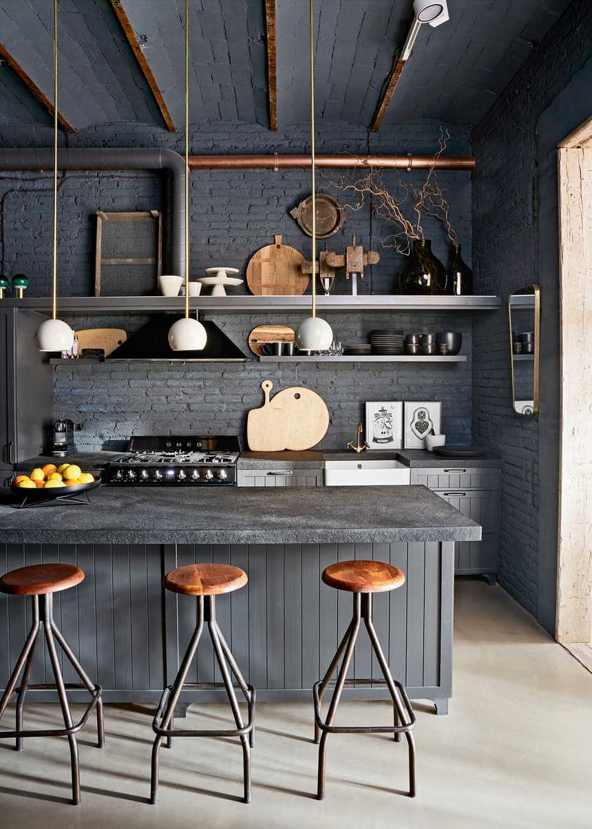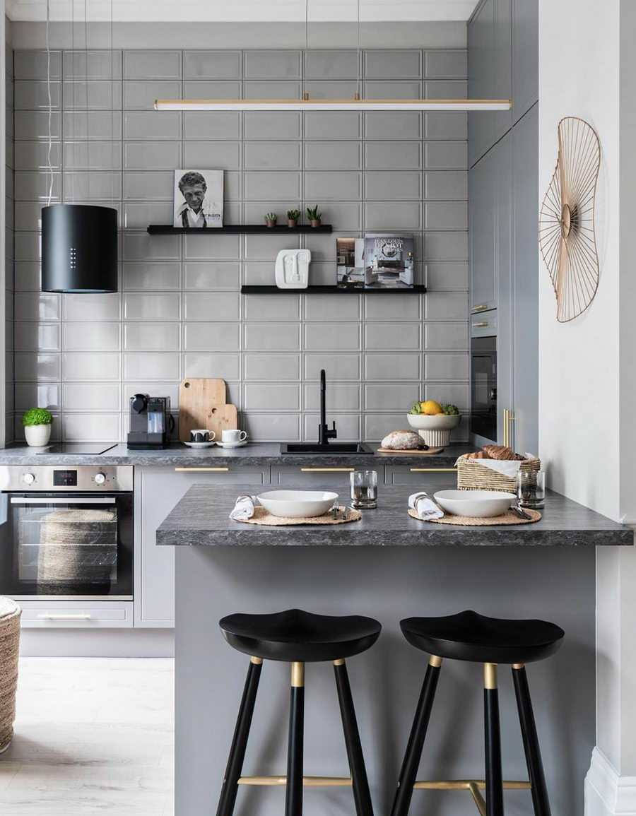 Нам нравится фартук из светлой плитки в стиле метро, и разве латунная отделка не выделяется на фоне угольного цвета?!