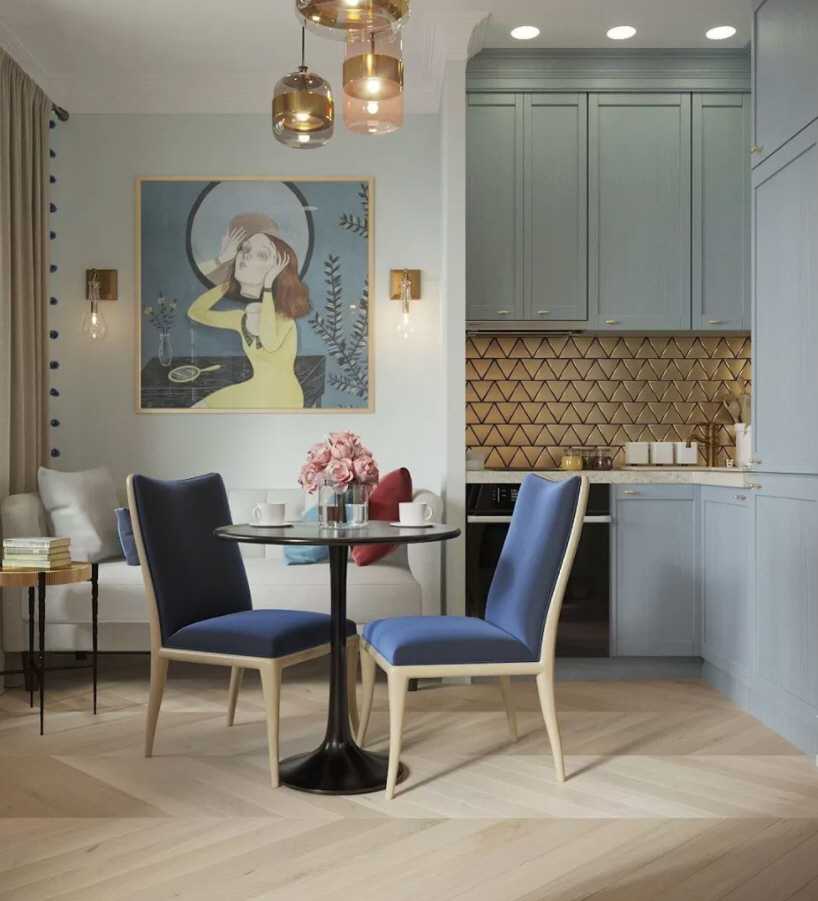 Синий и голубой в сочетании с серым придадут интерьеру строгость, но могут сделать комнату излишне холодной. Сочетание с синим выглядит красиво, но требует много естественного освещения. Голубой цвет сливается с серым, а белый или бежевый тон разбавит их комбинацию.