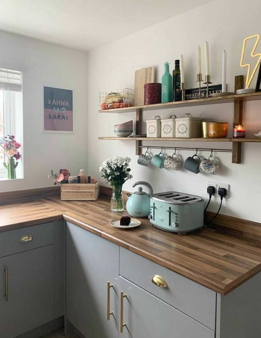 Серые шкафы сочетаются с золотой фурнитурой, а деревянная столешница придает дизайну богатство. Нам также нравится шестигранный пол из керамической плитки.