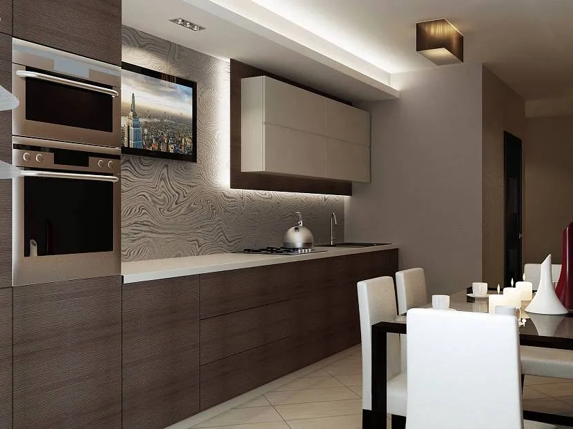 Современный хай-тек дизайн тоже выглядит весьма любопытно в коричнево-бежевых тонах. Отдайте предпочтение оттенку молочного шоколада или кофейному — слишком темные тут смотрятся не так эффектно.