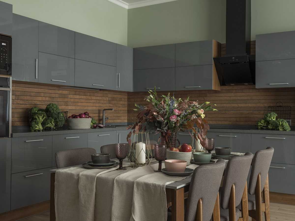 Если говорить об комбинации с серым цветом, тогда стоит оформить полы, фасады, или плитку в зеленом, а стены и мебель сделайте серыми оттенками. Именно такая гармоничность использования поможет создать современный дизайн вашей кухни.