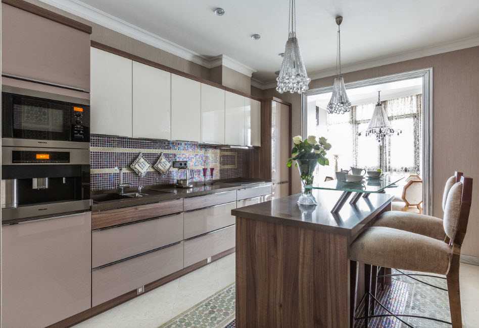 Красивая кухня получится, при установке элегантного гарнитура без резких линий. Оттенок коричневого лучше выбрать потемнее — тогда беж подчеркнет его глубину. Такой дизайн в стиле минимализма подойдет помещению любых габаритов — универсальный, проверенный годами вариант.
