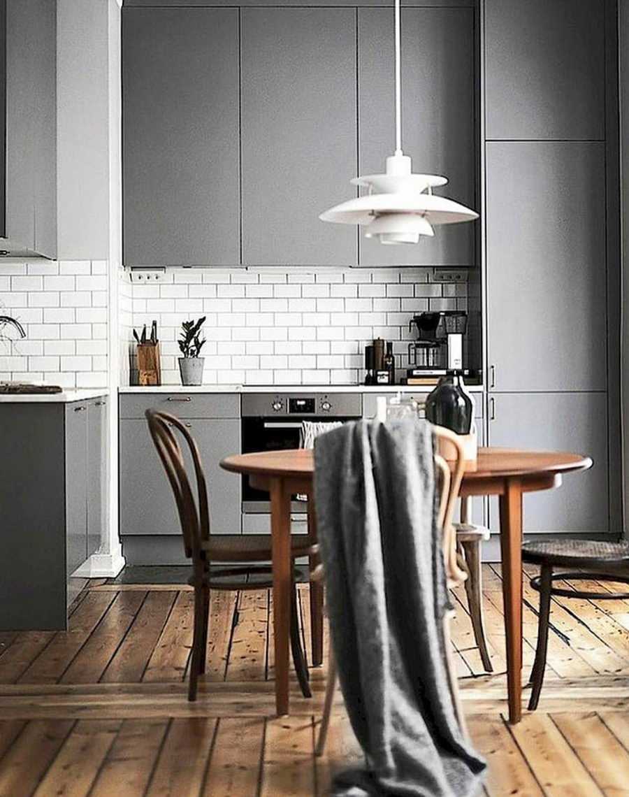 Деревянные детали придают помещению дорогой вид. Варианты для серой кухни – обеденный стол, плюс классические стулья или стулья с деревянными деталями, столешница, кухонный фартук под «дерево», а также пол из деревянных досок, ламината или линолеума с деревянной фактурой.