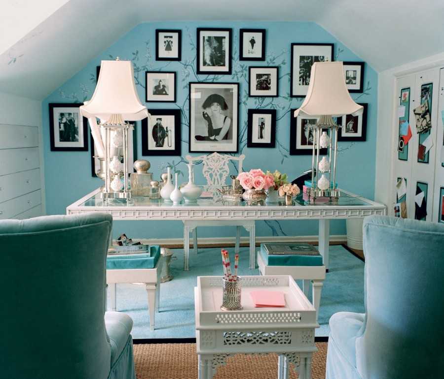 Комнате, в которой предстоит часто и подолгу трудиться не помешают бодрящие нотки цвета Тиффани. Но не стоит превращать рабочее пространство в романтичное зефирное «царство». Избежать чрезмерного украшательства помогут аксессуары строгой и сдержанной формы. Обстановка должна способствовать сосредоточению, настраивать на рабочий процесс. Достаточно ввести пару аксессуаров – вазу, настольную лампу, статуэтку, органайзер, повесить на окна нежно-бирюзовые шторы, а пол украсить ковром того же оттенка.