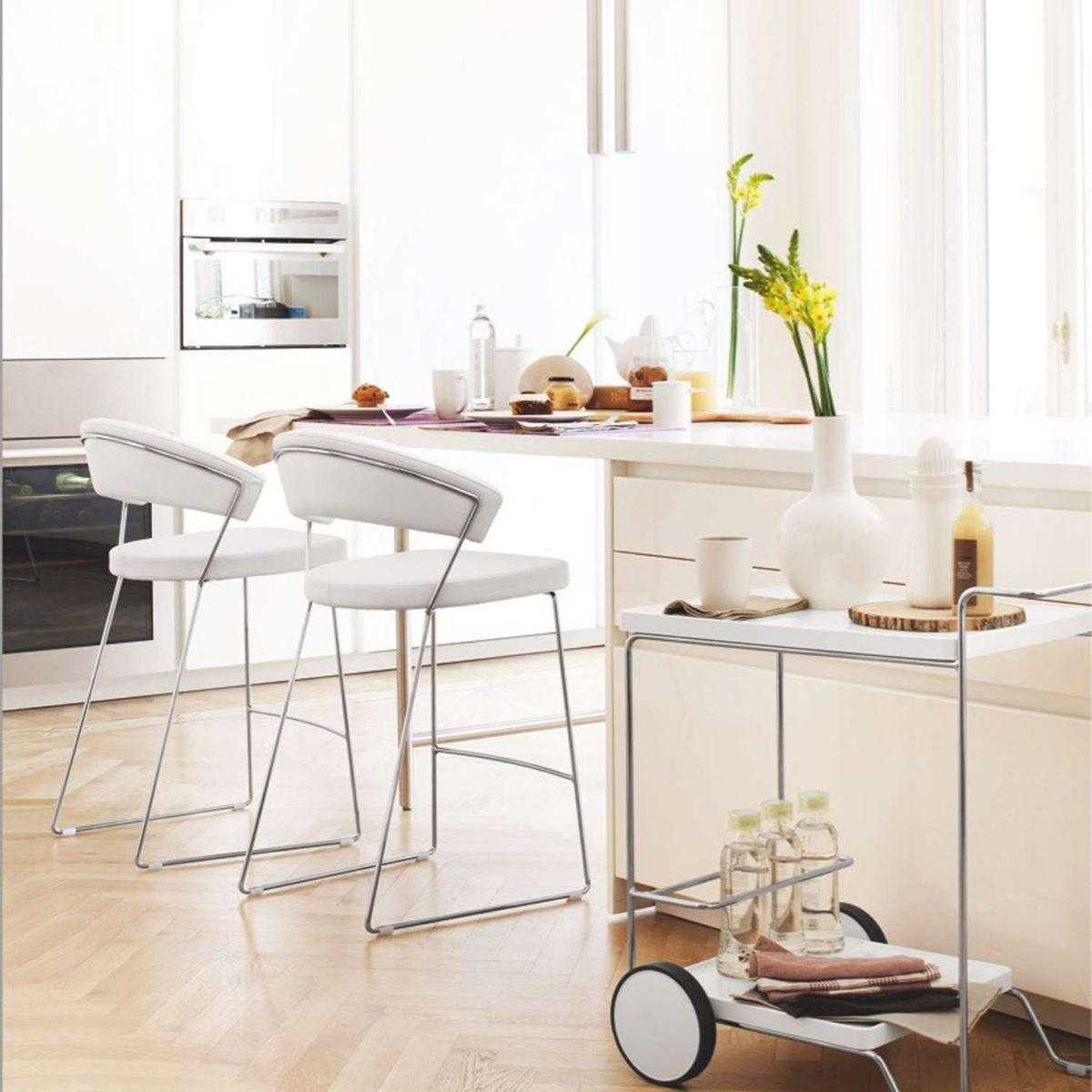 - Такая модель предполагает обязательное применение специальных стульев или табуретов. Эти изделия отличаются более высоким расположением сиденья над уровнем пола, для удобства оснащены подножкой. Однако подобные конструкции гораздо дороже традиционной мебели для сидения, менее удобны и не способствуют длительному времяпрепровождению.