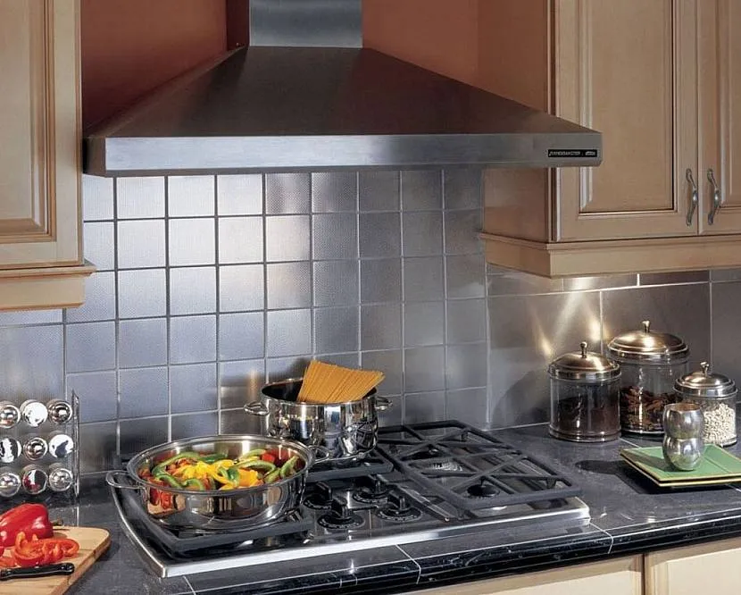 Фартук для кухни из металла в строительном магазине представлен в разных формах. Материал часто предлагают в виде цельной пластины. По параметрам заказчика из листа вырезают нужный кусок, который потом приклеивают к основе (фанере, ДСП). Готовую конструкцию монтируют на стену при помощи клея или устанавливают на каркас из профиля. Получается идеальная ровная поверхность, без швов и стыков.