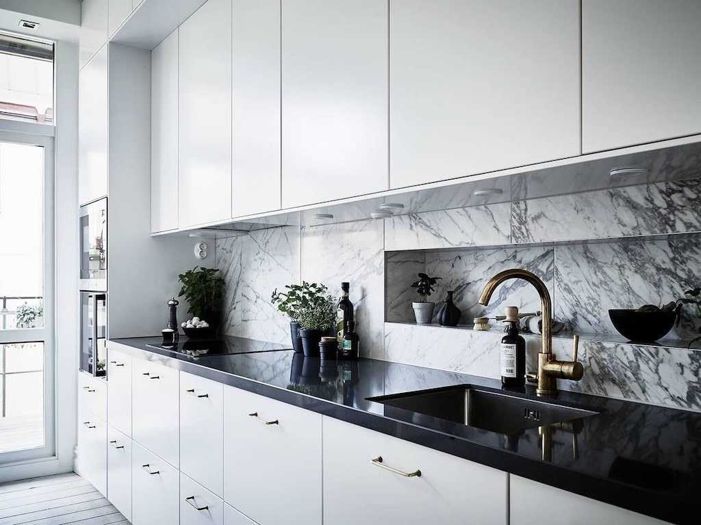 Дизайн кухни под мрамор — воплощённая роскошь. Поскольку это натуральный природный материал, плитка будет обладать уникальным рисунком. Фартук для кухни с мраморной плиткой придаст интерьеру респектабельность. Почитатели эстетики и долговечности отдают свое предпочтение этому виду отделки. На мраморной плитке не так видны загрязнения, как на глянцевой.