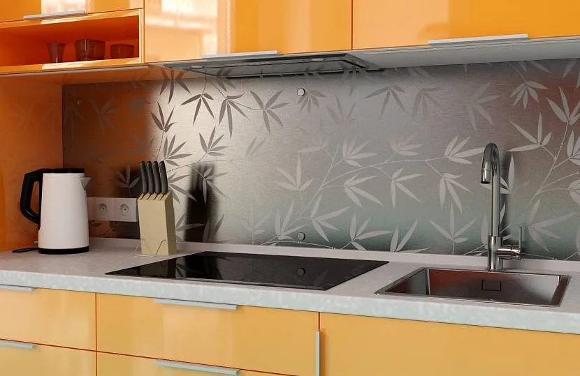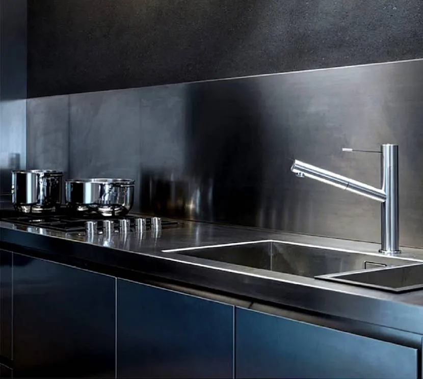 Прочный, практичный материал идеально подходит для оформления рабочей зоны в помещении для приготовления пищи. У сырья высокая степень отражения, почти как у зеркала. Характеристики помогают оптически увеличить крохотную комнату или подчеркнуть размеры большой кухни.
