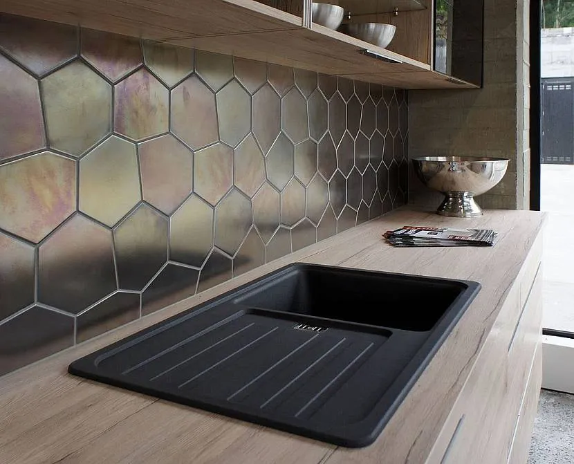 Металлический фартук для кухни часто разрезают в форме плиток. Популярная прямоугольная отделка выглядит лаконично и строго. Оригинально смотрится облицовка в виде квадратов, ромбов или треугольников. Модель соты привносит в дизайн роскошные нотки. Края отделки бывают ровными и с фацетами.