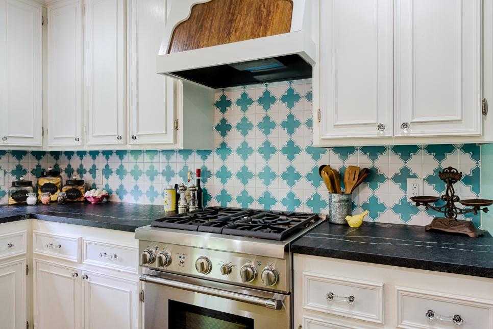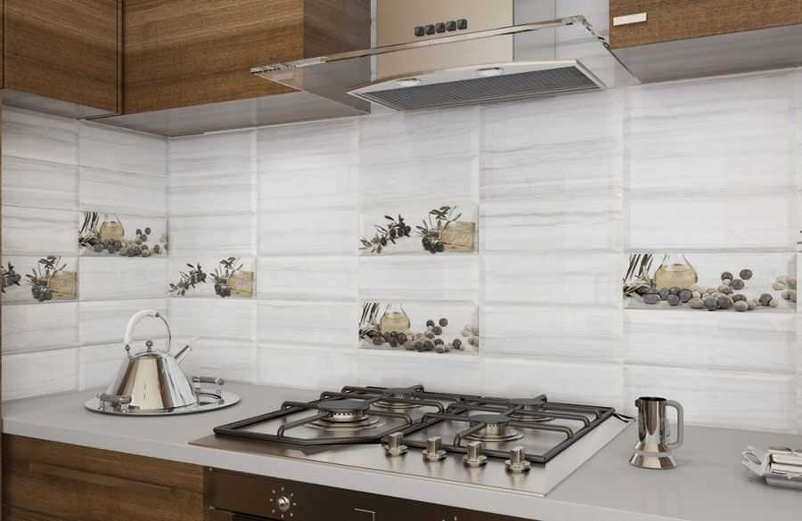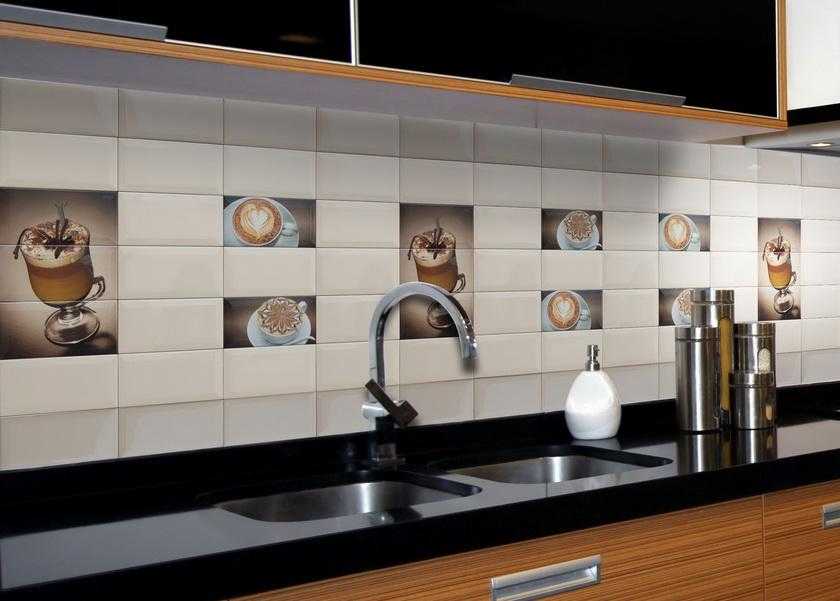Кроме самой традиционной плитки, для кухонных фартуков можно использовать декоративные вставки. Они также изготавливаются из керамики, но с растительным орнаментом, разными другими рисунками. Такие вставки сделаны в общей цветовой гамме с базовой керамической плиткой, но позволяют разбавить дизайн интересными акцентами. В качестве рисунков могут быть цветы, абстракция, городские пейзажи, буквы, надписи, силуэты и стилизованные кулинарные изображения.
