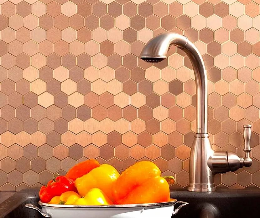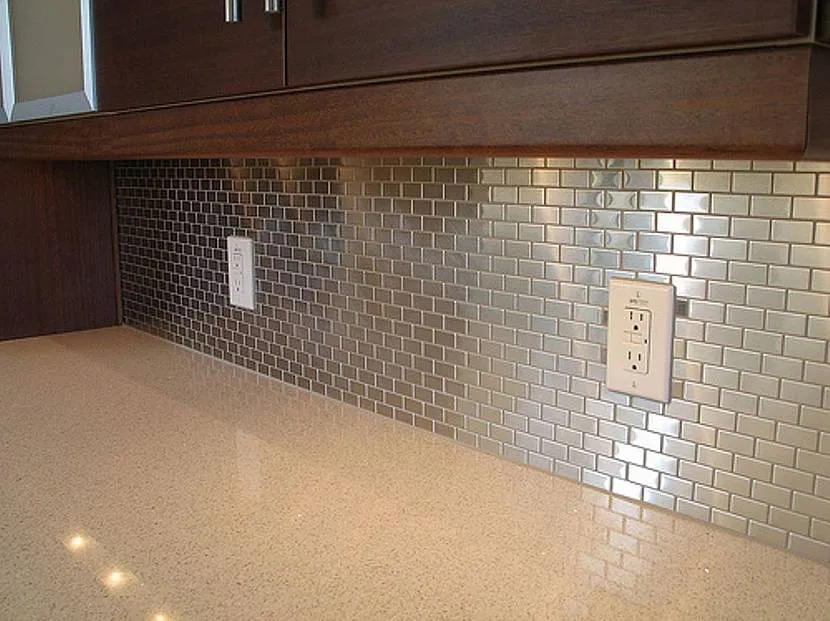 Металлический фартук для кухни выпускают в форме мозаики. Из кусочков собирают рисунки, орнаменты или располагают в хаотичном порядке. Создавая изображение, в одном полотне сочетают разные цвета и фактуры. Укладывая под определенным углом можно получить как таинственное притенение, так и яркое отражение.