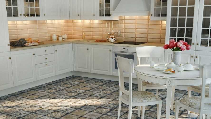 Хороший пример — сливочный гарнитур с каменной фактурой пола и мятными стенами. Светлый оттенок стен позволяет визуально сделать менее громоздкой мебель на кухне. Если вы хотите подчеркнуть объемность кладки, можно использовать плитку в виде рельефных керамических кирпичей.