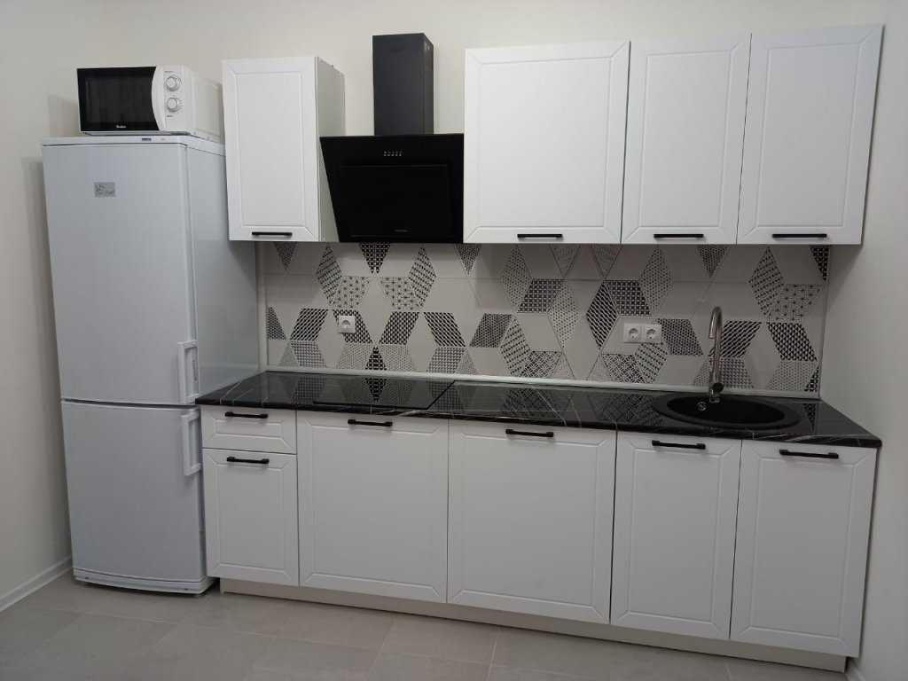 Смотрите дизайн кухни в белых тонах с керамической плиткой, выложенной шахматным порядком, на фото.