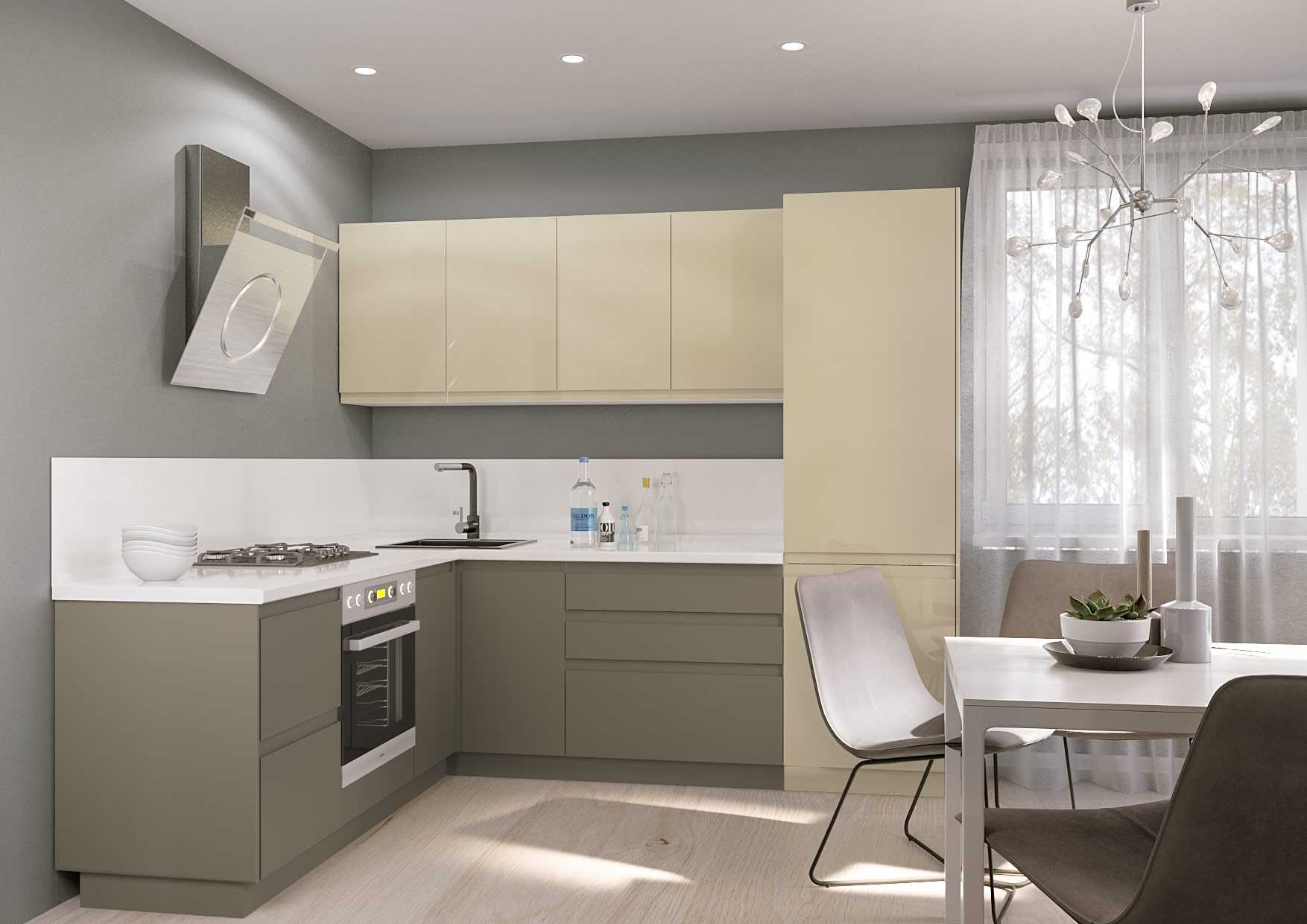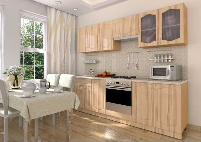 Идеальный вариант для тех, кто ценит простоту, функциональность и элегантность. Обустроить такое помещение довольно просто, для отделки стен можно использовать любые материалы: штукатурку, моющиеся обои, гипсовые панели, керамическую плитку. Светлые тона наполнят кухню легкостью, сделают ее более просторной.