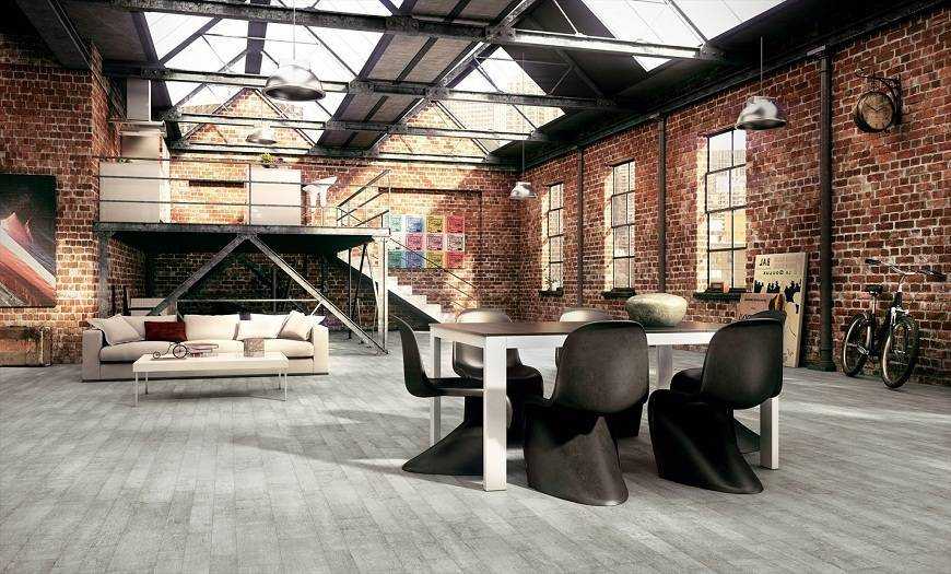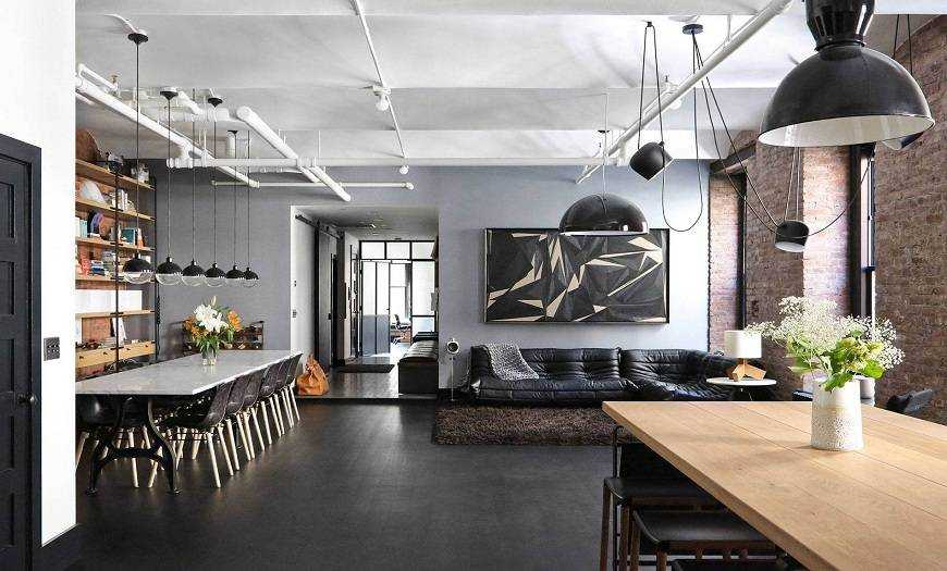 По максимуму применять отделку в индустриальной стилистике: стены из кирпича, бетонные поверхности, выставленные на показ коммуникации.