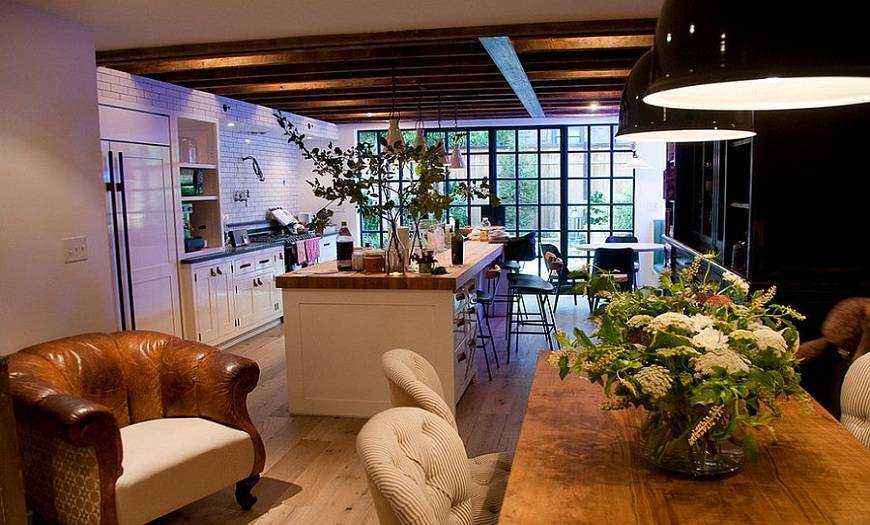 В стиле лофт необходимо оформить хотя бы еще одну комнату. Лучше соединить кухню с гостиной, если в этом стиле весь дом выполнен не будет. Стиль хорошо соседствует с классикой, хай-теком, минимализмом. У нас есть отдельная статья о сочетаниях лофта с другими стилями. В осутствии же стен, зоны можно отделить занавесками, как показано на фотографиях ниже.