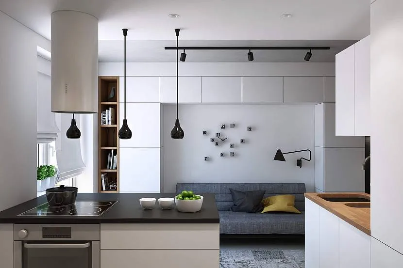 В большинстве обычных квартир окна обладают небольшим размером. Их выигрышно выделяют за счет контрастного цвета. Можно, к примеру, окрасить коробки в черный колер, а стены оформить в светлой гамме. Зону для приготовления пищи выделяют при помощи меблировки с барной стойкой.