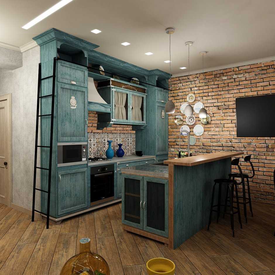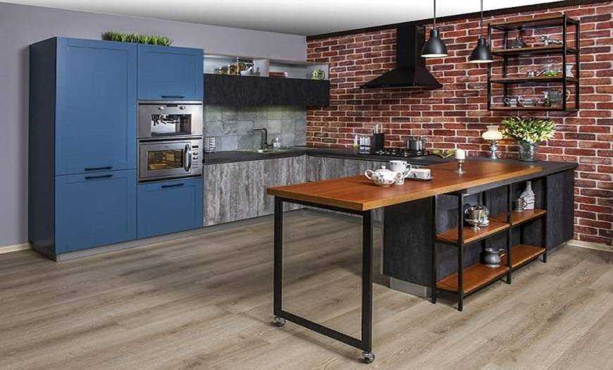 Синяя кухня в смешанном стиле: лофт, классика, современность.