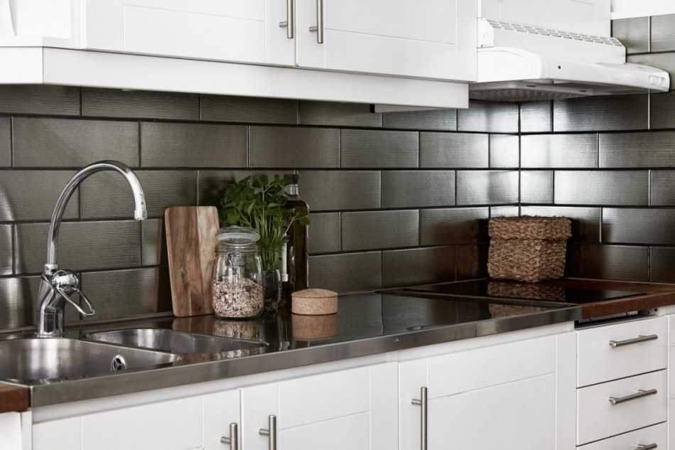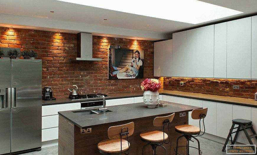 Хорошее решение — побеленная кирпичная кладка с акцентом — кухонным фартуком контрастного цвета.