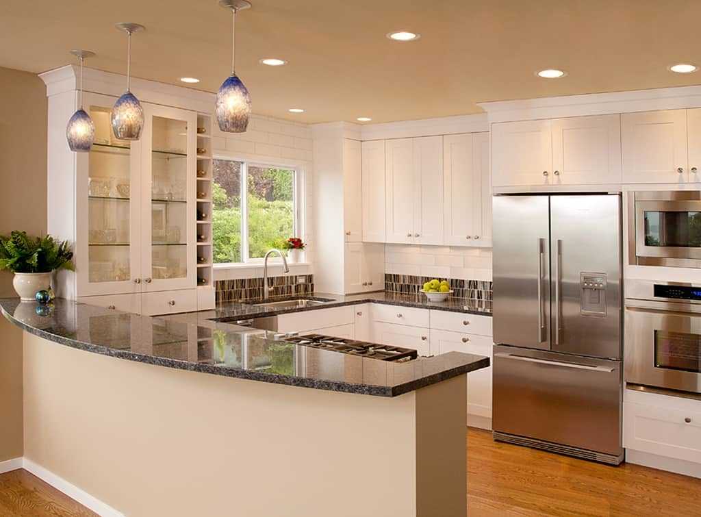 углом – подходит для малогабаритных кухонь, позволяет освободить место для перемещения, в квартире-студии поможет разделить функциональные зоны;
