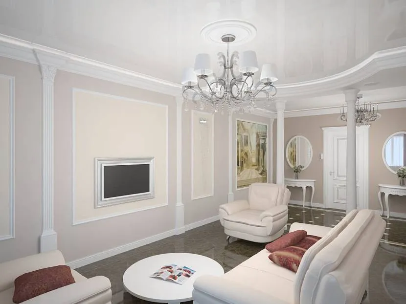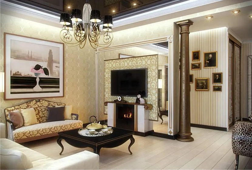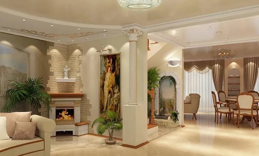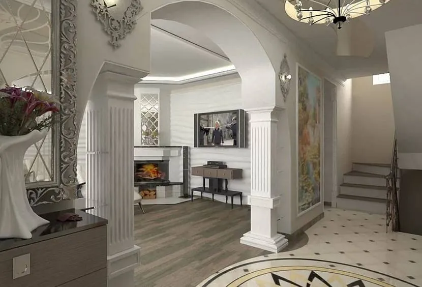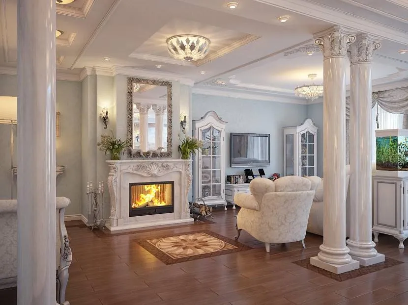 Классический стиль. Его отличительной чертой являются изысканные и лаконичные приёмы оформления. Декоративные колонны могут быть белоснежными, облицованы пенополиуретаном, пенополистиролом, гипсом. Подчеркнуть отношение к классике можно любыми элементами лепнины. Неплохим решением станет белая либо светлая венецианская штукатурка, имитирующая мраморную роспись или другие виды натурального камня дорогих пород.
