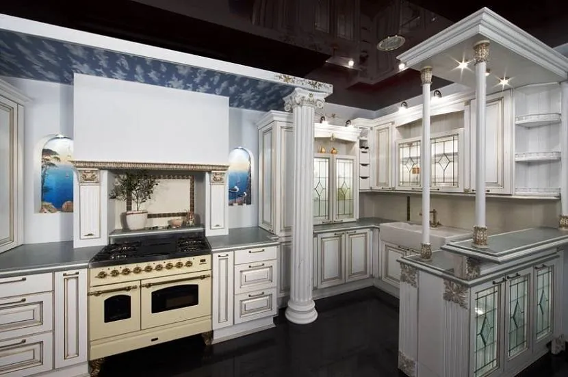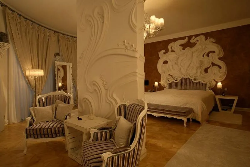 Барокко. Помпезный, роскошный античный дизайн не приемлет полумер, поэтому колонны в комнате предпочтительны из натурального камня, красного дерева и других дорогих материалов. Уникальность подчеркивается сложным декором капители, чтобы выделить этот элемент добавьте подсветку снизу.