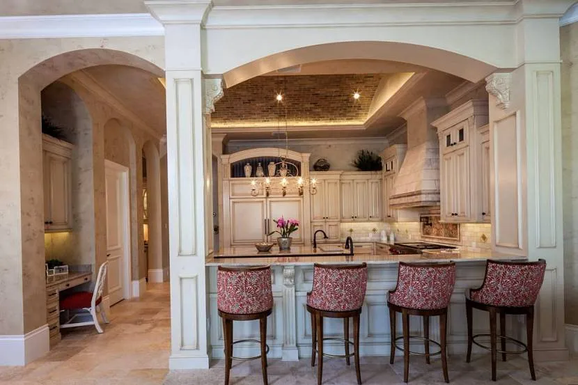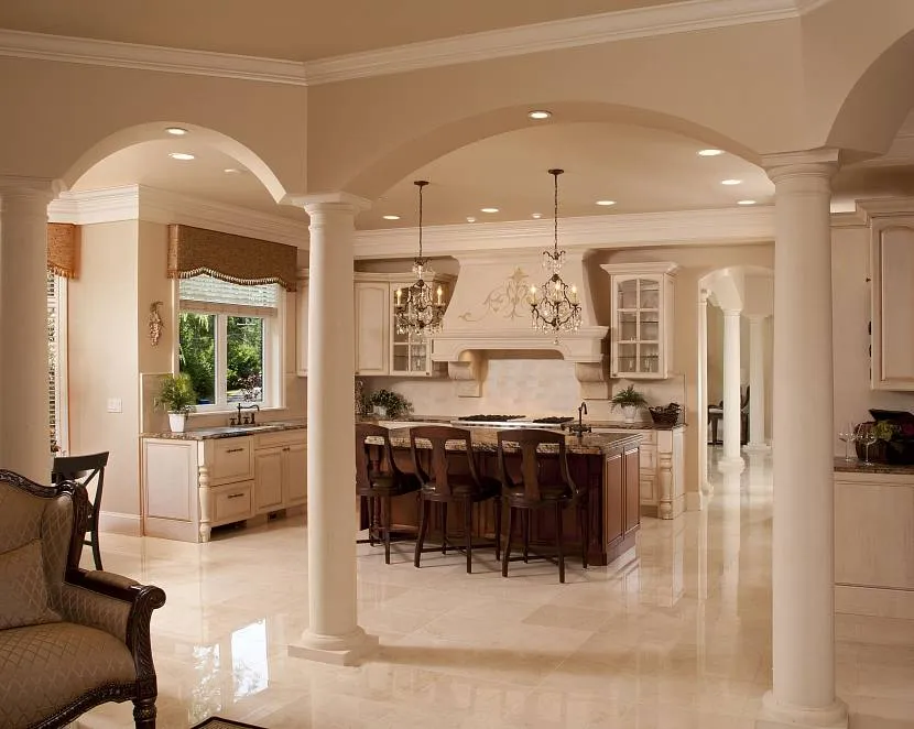 Колонны, выдержанные в восточном стиле, отлично смотрятся в интерьере квартир-студий. Отсутствие перегородки между кухней и гостиной обыгрывается потолочной сводчатой аркой, прекрасно зонирующей пространство комнаты. Она не только чётко ограничит зону приготовления пищи от места для отдыха или приёма гостей, но и не займёт свободной площади, не станет преградой для естественного освещения и превратится в «настоящую изюминку» вашего жилища.