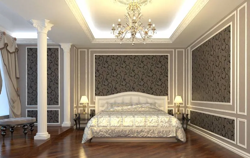 Спальная с колоннами, оформленная в классическом стилеИсточник regodesign-msk.ru