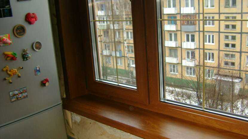 Черные пластиковые окнаОкна под дерево в интерьере кухниБольшие окна под дерево