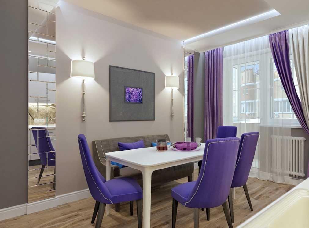 Если фиолетовый используется только в обивке стульев или мягкого уголка и аксессуарах, его необходимо поддержать аналогичного оттенка шторами. Такой приём характерен для стиля арт-деко или Прованса.