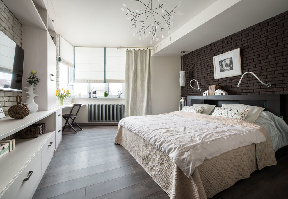 Если помещение просторное, продумайте заранее, что именно из обстановки вам нужно, кроме кровати и тумбочек. Представьте, как вы расставите мебель