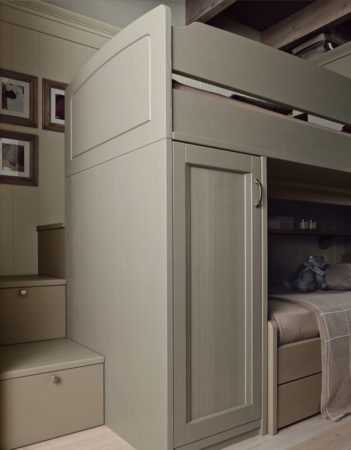 - Эргономичным дополнением служит лестница, ступени которой оснащены выдвижными ящиками.