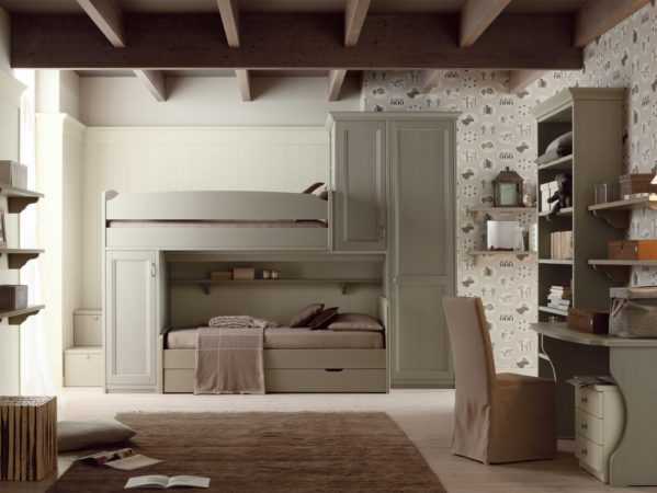 Комплект содержит две кровати, встроенные шкафы и ящики, навесные стеллажи.