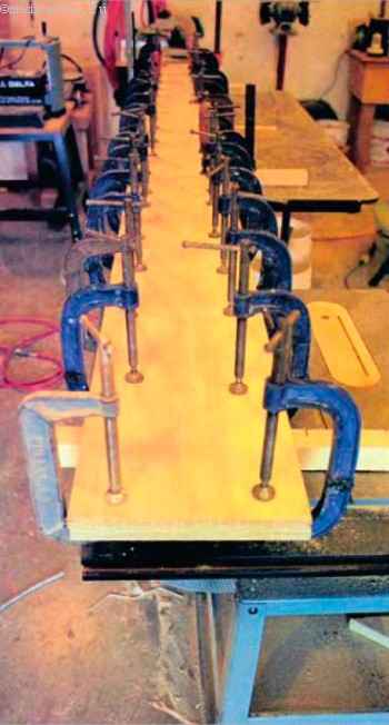 После того, как клей затвердевает, я освобождаю сборку косоура от струбцин, а затем с помощью угольника вычерчиваю на заготовке профиль тетивы.