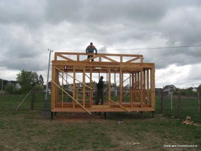Каркасное строительство своими руками, как известно, обычно производят по технологии «платформа». Однако было принято решение не следовать данному совету, поскольку существовала вероятность, что утеплитель вымокнет, если пойдет дождь. Так и решили делать.