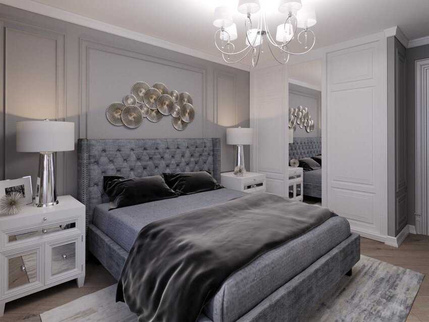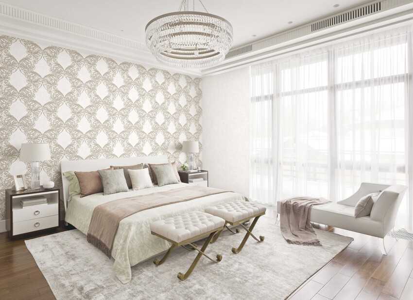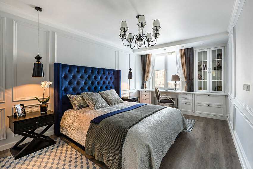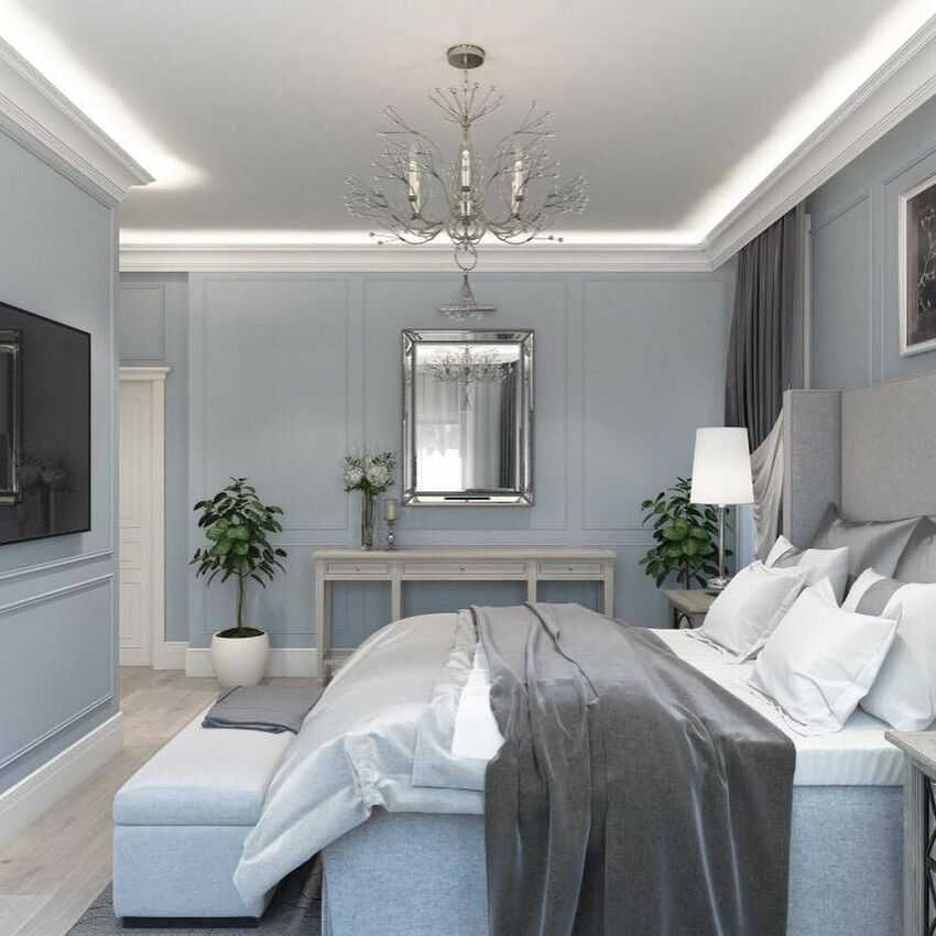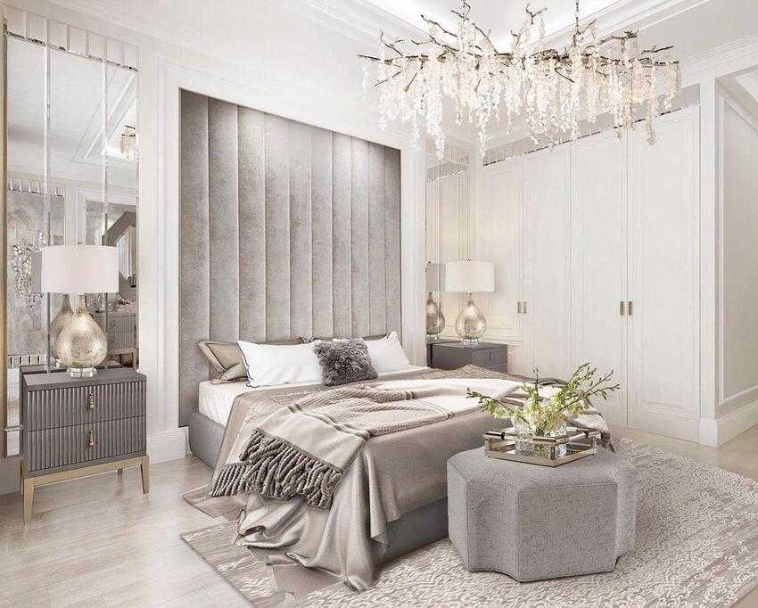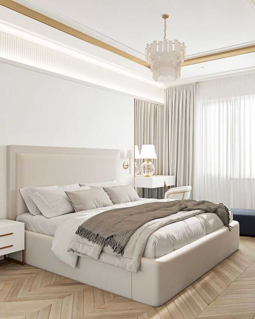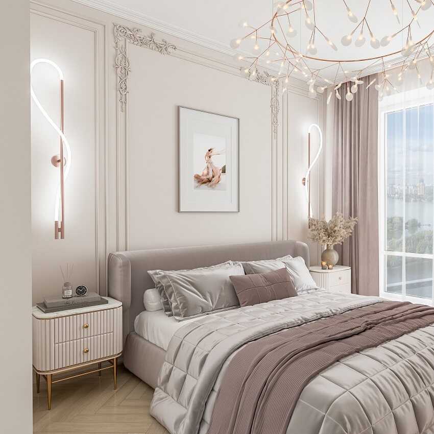 Пример идеально подобранного освещения для спальной комнаты в стиле неоклассика.
